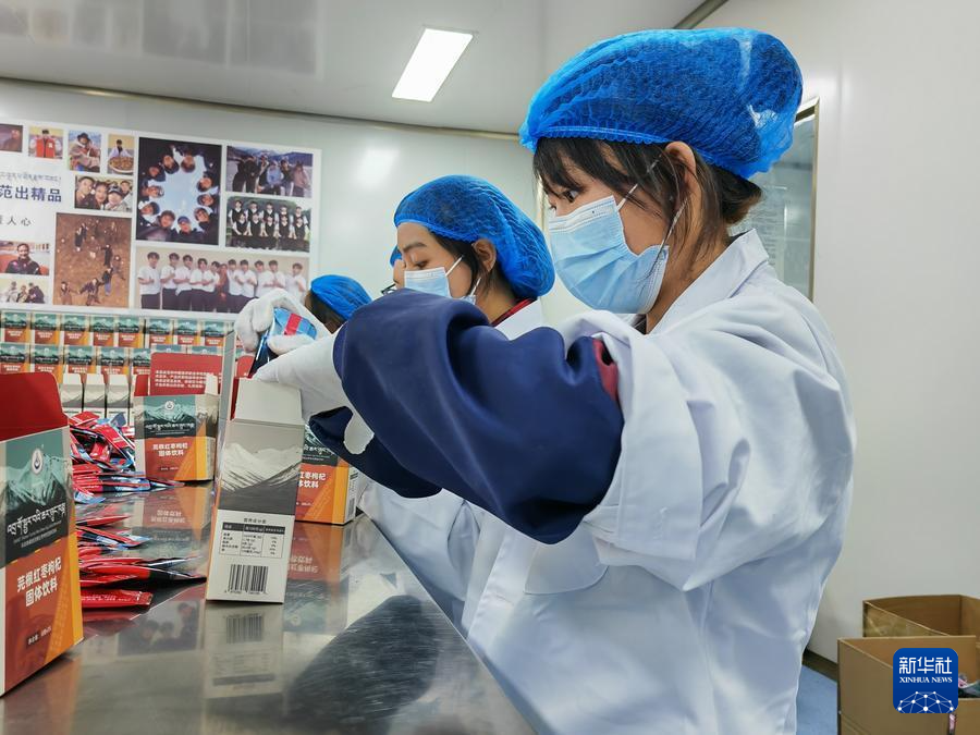 图为囊谦县芫根工厂的工人正在打包芫根红枣枸杞固体饮料。新华社记者 柳泽兴 摄